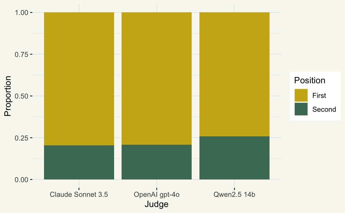 A more rigorous way to quantify this would be position consistency, where we run the comparison with both orders and see how often the model prefers the same response either way (Gu et al. 2025).